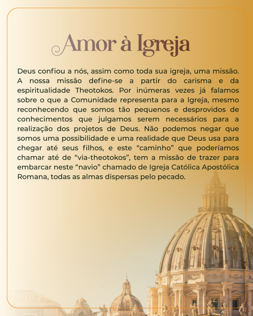 Deus confiou a nós, assim como toda sua igreja, uma missão. A nossa missão define-se a partir do carisma e da espiritualidade Theotokos. Por inúmeras vezes já falamos sobre o que a Comunidade representa para a Igreja, mesmo reconhecendo que somos tão pequenos e desprovidos de conhecimentos que julgamos serem necessários para a realização dos projetos de Deus. Não podemos negar que somos uma possibilidade e uma realidade que Deus usa para chegar até seus filhos, e este “caminho” que poderíamos chamar até de “via-theotokos”, tem a missão de trazer para embarcar neste “navio” chamado de Igreja Católica Apostólica Romana, todas as almas dispersas pelo pecado.